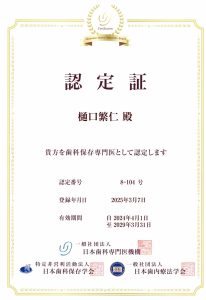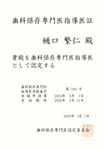 医療法人繁玲会 理事長 樋口繁仁は認定試験、臨床実績から2025年3月7日付けで「歯科保存専門医」ならびに「歯科保存専門医指導医」に認定されました。